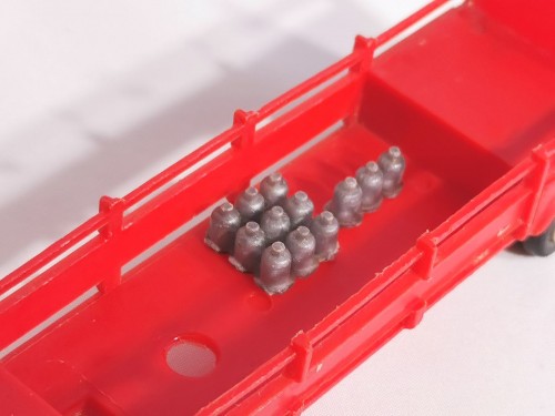 L’exemplaire proposé est une version nue, sans les marquages ni les panneaux publicitaires Primagaz, ce qui en fait une pièce intéressante pour restauration ou pour compléter un attelage incomplet. Elle est accompagnée de 12 bouteilles de gaz miniatures, éléments d’origine rarement conservés en lot.