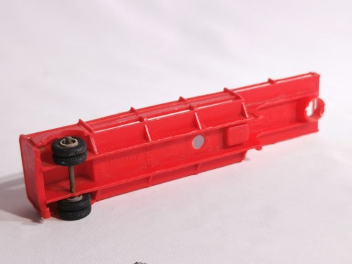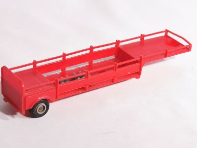 Réalisée en plastique rouge, à l’échelle 1/86, elle mesure environ 134 mm de longueur pour 28 mm de hauteur. Sa structure ouverte avec ridelles latérales fines est caractéristique des miniatures Norev de cette période.
