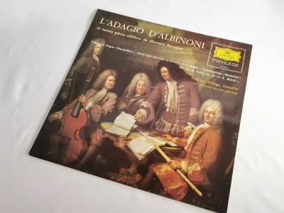 Disque vinyle 33T Adagio d'Albinoni et autres pièces célèbres de musique baroque, interprété par le Festival Strings Lucerne sous la direction de Rudolf Baumgartner, édité par Deutsche Grammophon – Collection Privilege. Œuvres de Albinoni, Pachelbel, Bach, Rameau, Purcell. Disque en parfait état, pochette avec quelques petites taches.