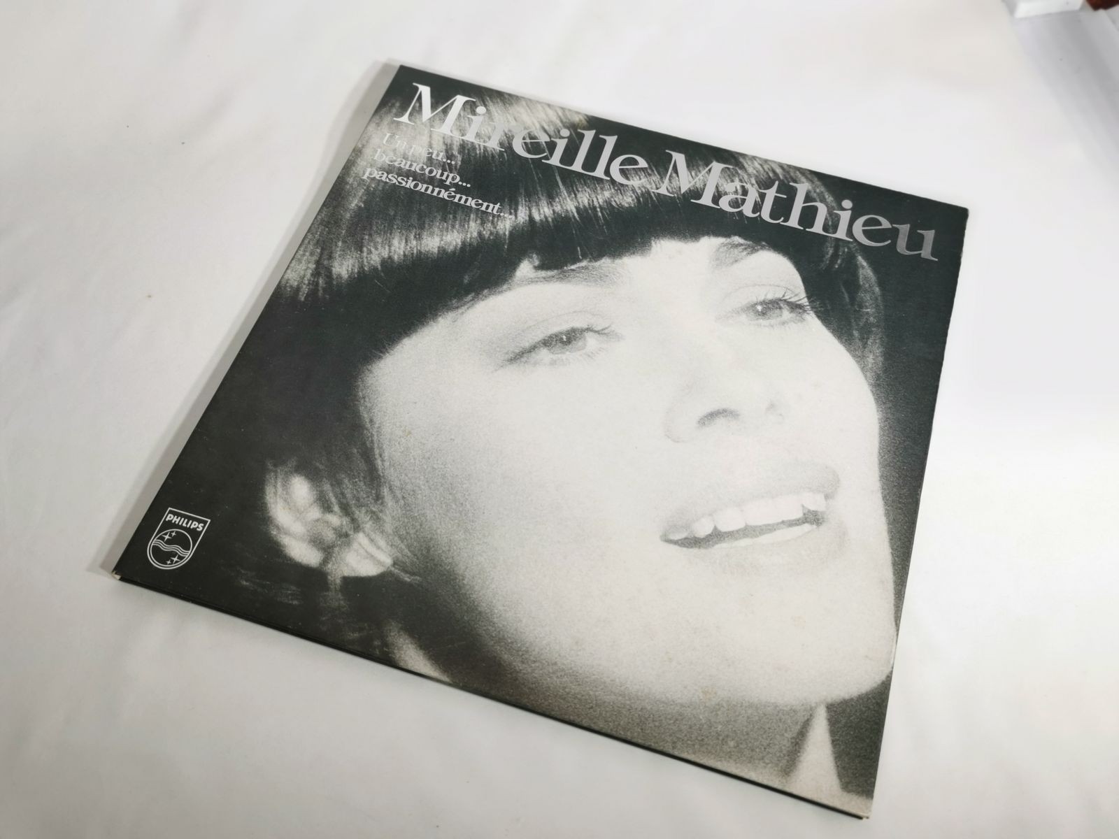 Disque vinyle 33T Un peu… Beaucoup… Passionnément de Mireille Mathieu, paru en 1980 chez Philips. Album emblématique de la variété française avec des titres comme Une femme amoureuse, On l’appelait Chicano ou Le canotier de Maurice Chevalier. Disque en parfait état, pochette avec petites taches intérieures.