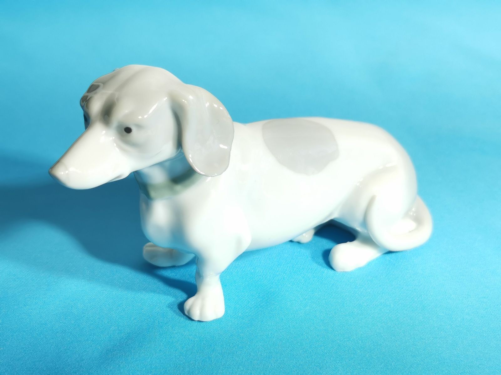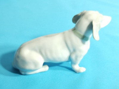 Élégante statuette représentant un teckel / dachshund assis, au pelage blanc ponctué de taches grises, dimensions 11×6 cm. La glaçure est parfaitement conservée, offrant un bel éclat et mettant en valeur les nuances de couleur.