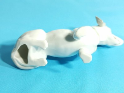 Statuette teckel / dachshund en céramique blanc à taches grises 11×6 cm, glaçure brillante, XXe siècle, parfait état.