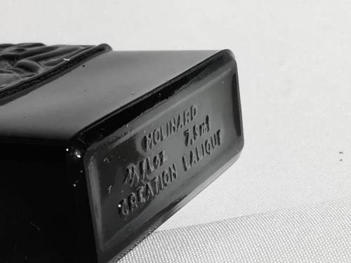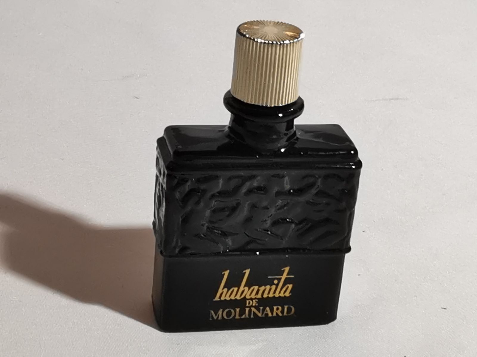 Cette miniature d’eau de toilette Habanita de Molinard reprend le célèbre flacon noir sculpté, inspiré des arts décoratifs, devenu emblématique de la parfumerie française. Le design de ce flacon est issu d’une création Lalique, référence majeure du verre artistique du début du XXᵉ siècle.
