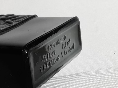 D’une contenance de 1/4 oz (7,5 ml) pour une hauteur d’environ 6 cm, ce flacon est à moitié plein. Le verre noir est en excellent état de conservation, sans éclat ni fêle, et les inscriptions moulées sous le flacon sont bien visibles. Un exemplaire représentatif d’un parfum mythique, apprécié tant pour sa fragrance que pour son flacon iconique.