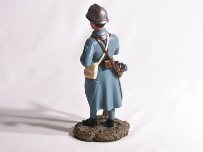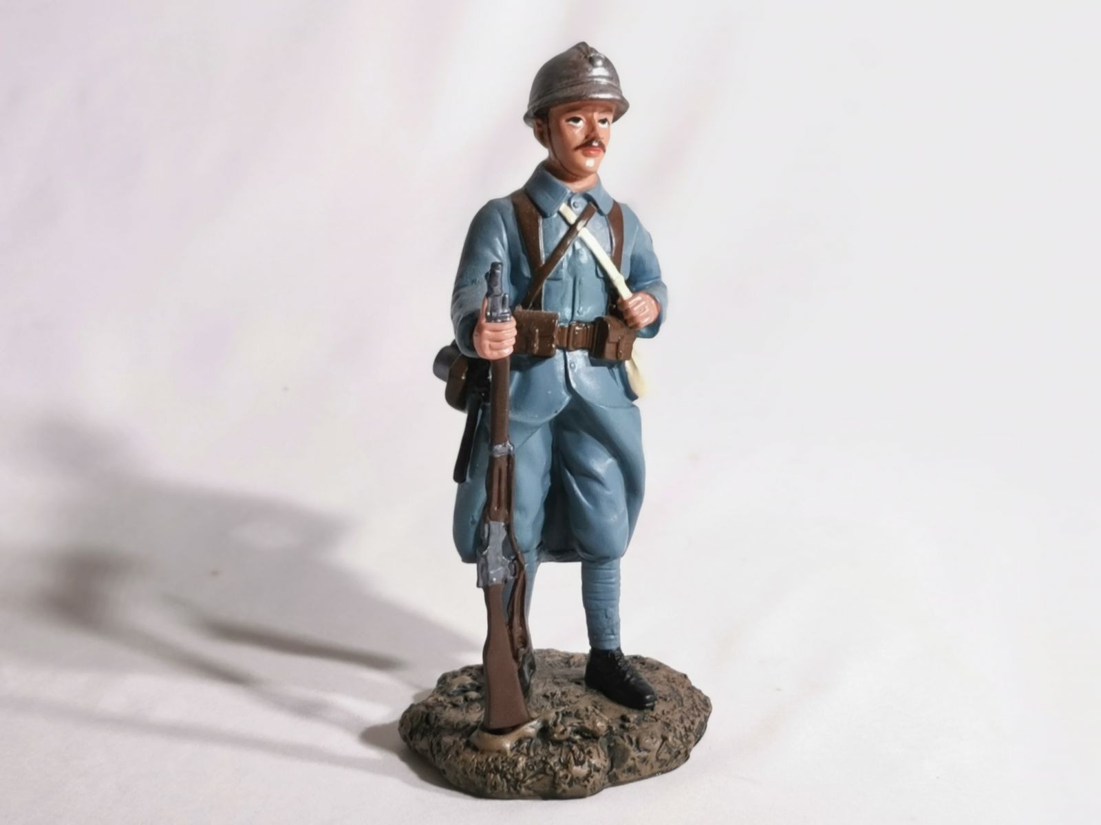 Cette figurine illustre un soldat français de la Première Guerre mondiale, communément appelé poilu, symbole emblématique des combats de 1914-1918. La tenue bleu horizon, le casque Adrian, l’équipement individuel et l’arme longue sont fidèlement reproduits, offrant une représentation réaliste du fantassin français sur le front.