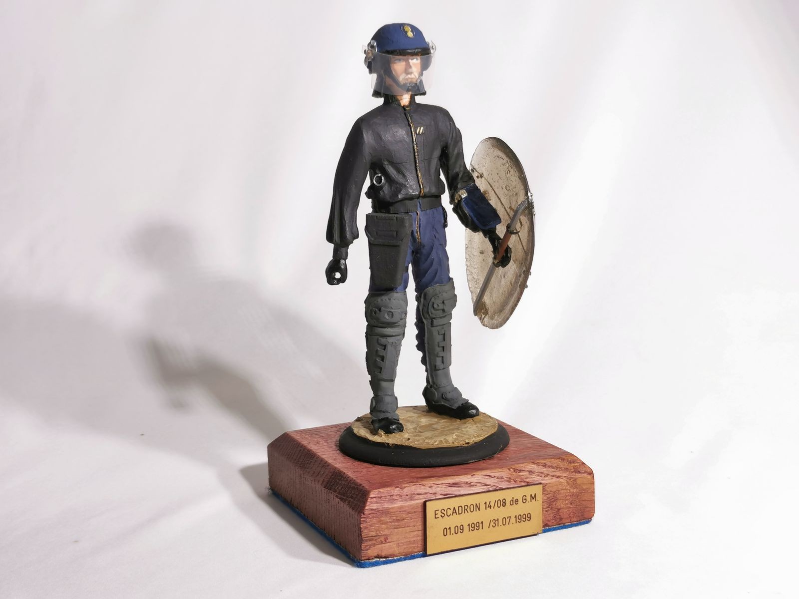 Figurine représentant un gendarme mobile de l’escadron 14/8 de G.M. de Beaune, réalisée en résine et montée sur socle bois avec plaque gravée.