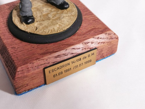 Hauteur 19,5 cm avec socle. Objet commémoratif, probablement remis lors du départ de l’escadron en 1999.