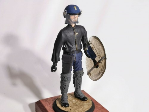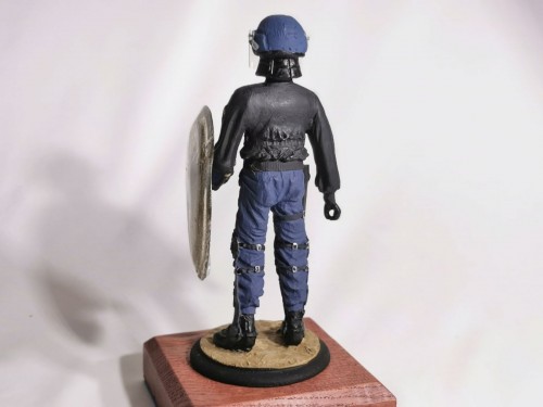 Cette figurine représente un gendarme mobile en tenue de maintien de l’ordre, typique des années 1990, équipé de son casque, de protections et d’un bouclier. La posture est réaliste et sobre, fidèle à l’iconographie de la Gendarmerie Mobile française de cette période.